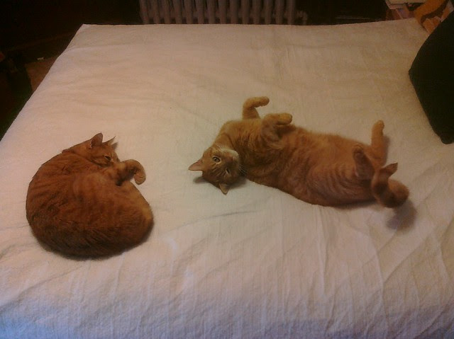 This week, we have a morning shot of our boys, Otis and Milo, staking their claims on our bed as I prepare to go to work. What is strange here is that Milo, who is typically rather reserved, is freely sprawled out while his usually rambunctious brother, Otis, assumes a more conservative pose. In fact, I had to wait for Milo to stop moving before I could even attempt to capture a photo with my Palm Pre!